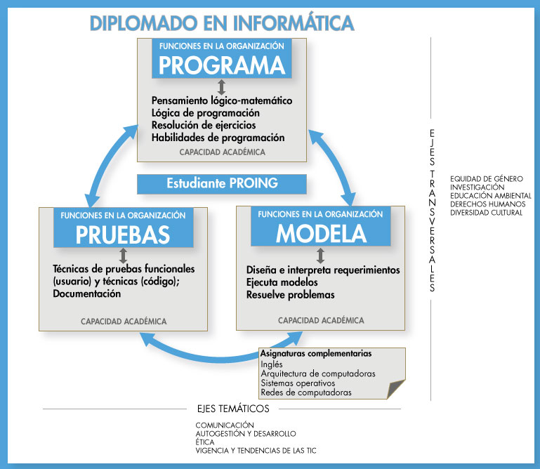 La carrera de Diplomado en Informática prepara profesionales en informática con capacidad de construir software según especificaciones, documentarlo, efectuar la implementación y el mantenimiento. Según la siguiente figura: